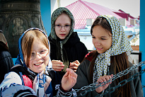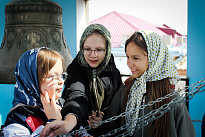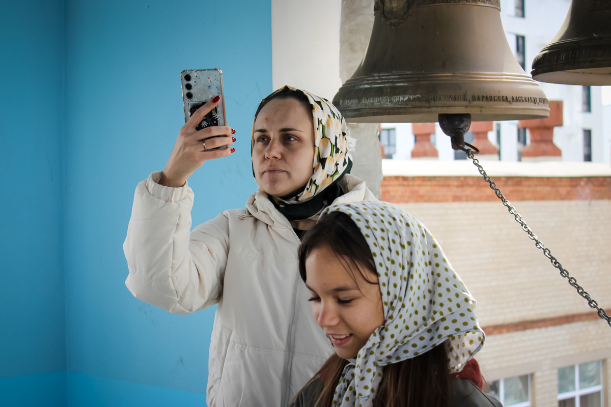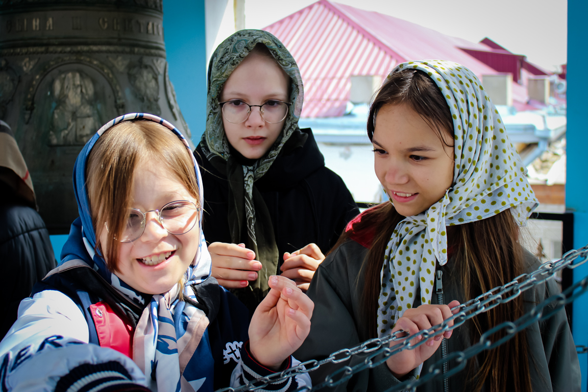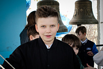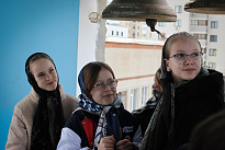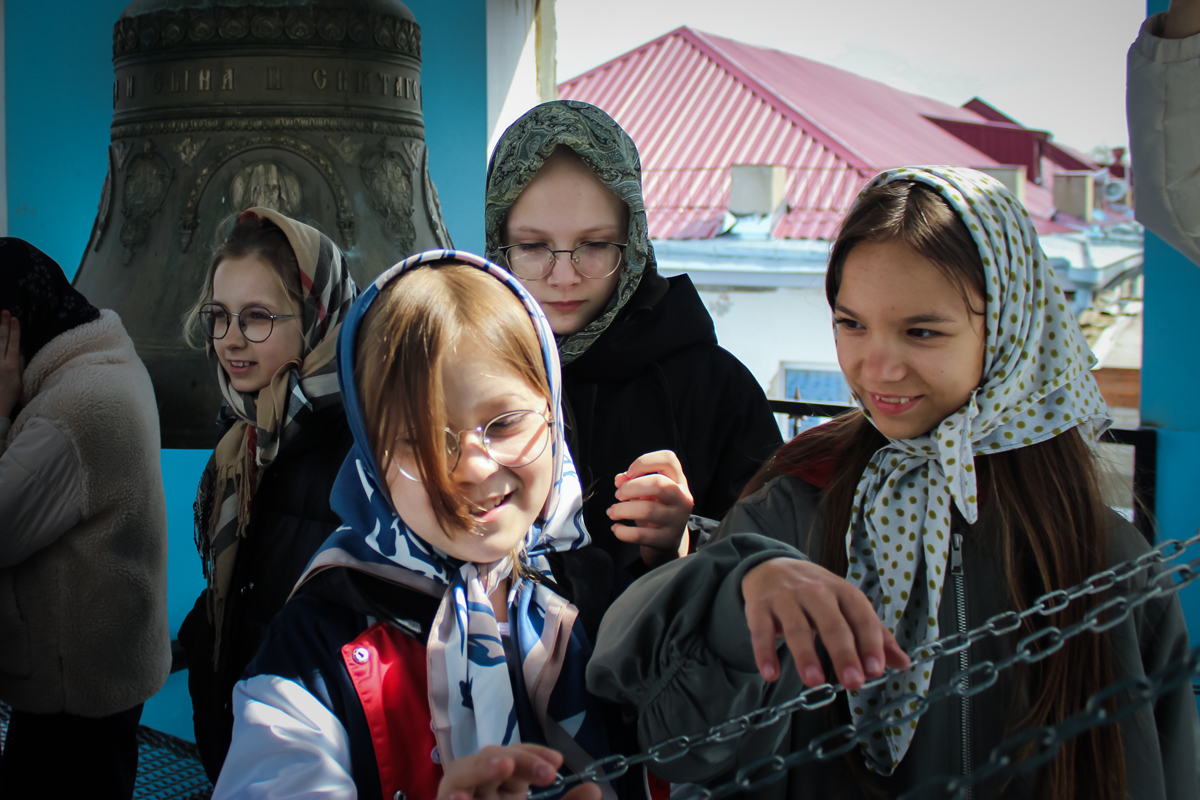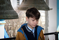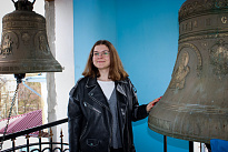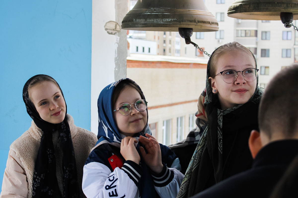 Затем школьники, в сопровождении учителей и ребят из группы молодежного служения поднялись на колокольню. Валерия Бакулина рассказала им о колоколах и пасхальном трезвоне или звоне «во вся» (во все колокола). Это торжественный, радостный и непрерывный звон, который символизирует торжество жизни и Воскресение Христа. Школьники смогли почувствовать себя юными звонарями.