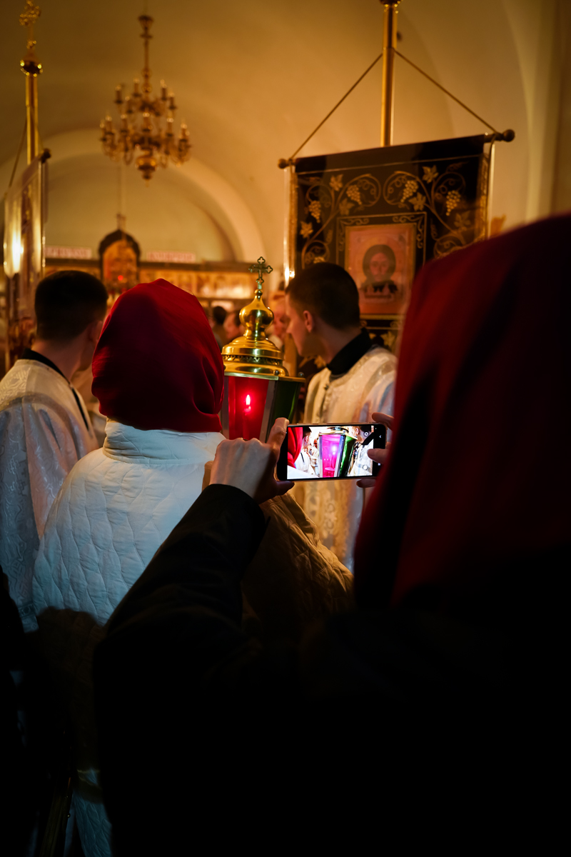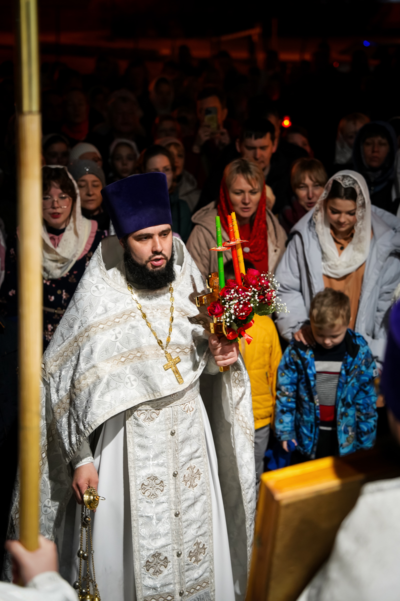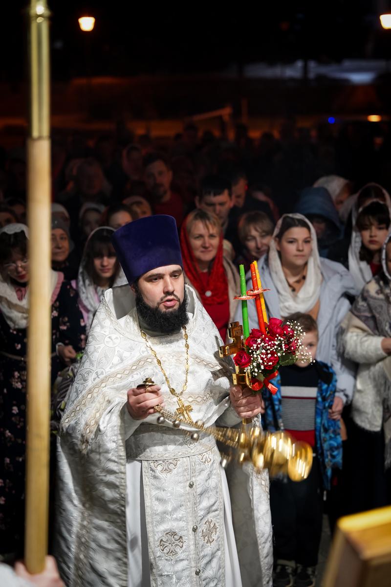 По древней традиции, первый возглас Пасхальной заутрени иерей Михаил произнес перед закрытыми дверями храма – в воспоминание того, что гроб Господа в момент Воскресения был запечатан печатью, а у дверей стояла стража и никто из людей не мог в него проникнуть.