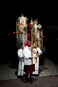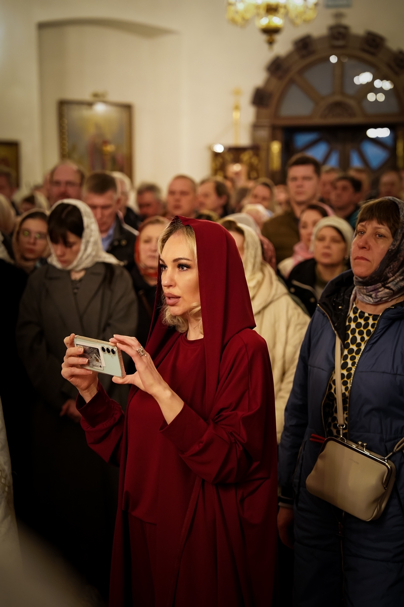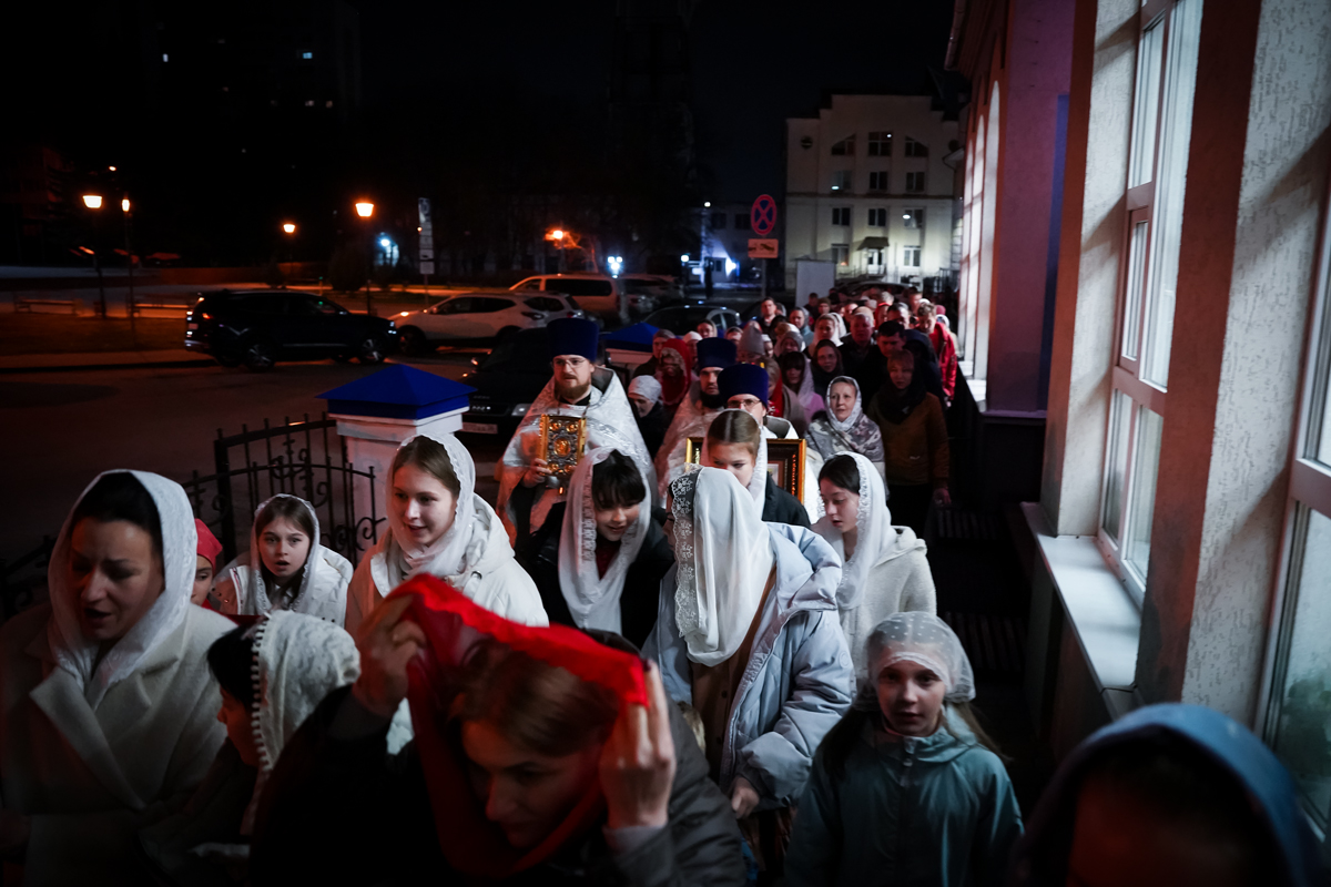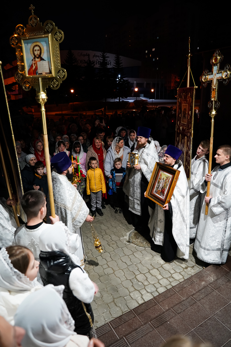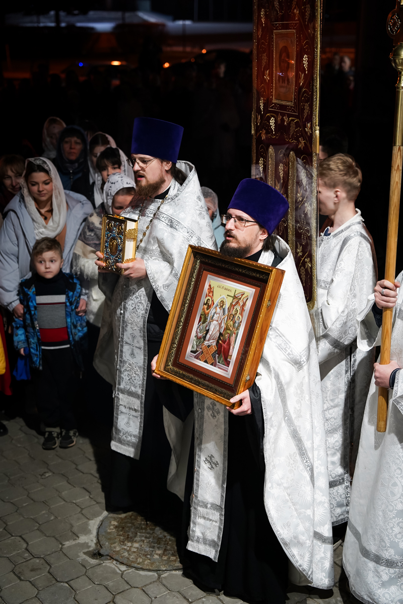 Затем, при пении стихиры «Воскресение Твое, Христе Спасе, Ангели поют на Небесех…», священнослужители и все богомольцы совершили крестный ход вокруг храма, что символизировало шествие жен-мироносиц ко гробу Христа Спасителя.