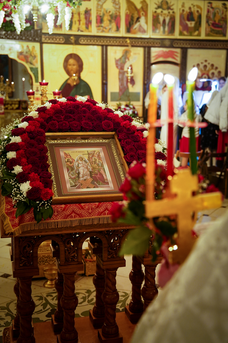 По заамвонной молитве было совершено освящение артоса – особого хлеба с изображением Воскресения Христова. Старинное наименование артоса – «просфора всецелая». Артос сохраняют в храме всю Светлую седмицу на аналое пред иконостасом. Во все дни Светлой седмицы по окончании литургии с артосом торжественно совершается Крестный ход вокруг храма. В субботу Светлой седмицы по завершении литургии читается молитва на раздробление артоса, после чего хлебы разрезают и раздают верующим.