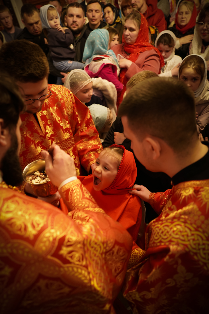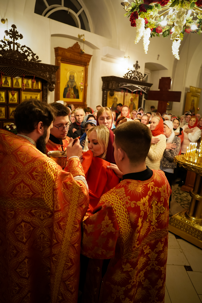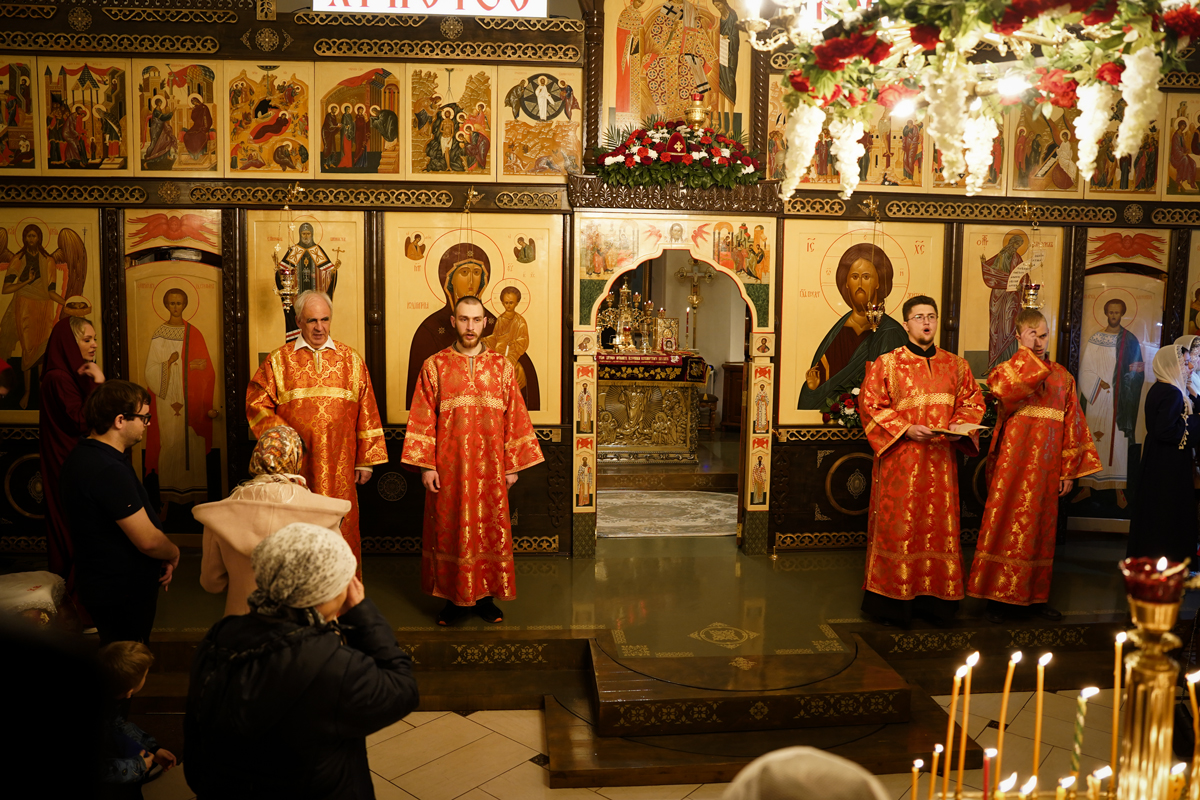 При пении Пасхального канона отец Михаил многократно совершал каждение, приветствуя молящихся вечно живыми словами Пасхального ликования: «Христос воскресе!» Все присутствующие в храме единодушно и громогласно отвечали: «Воистину воскресе!»