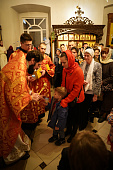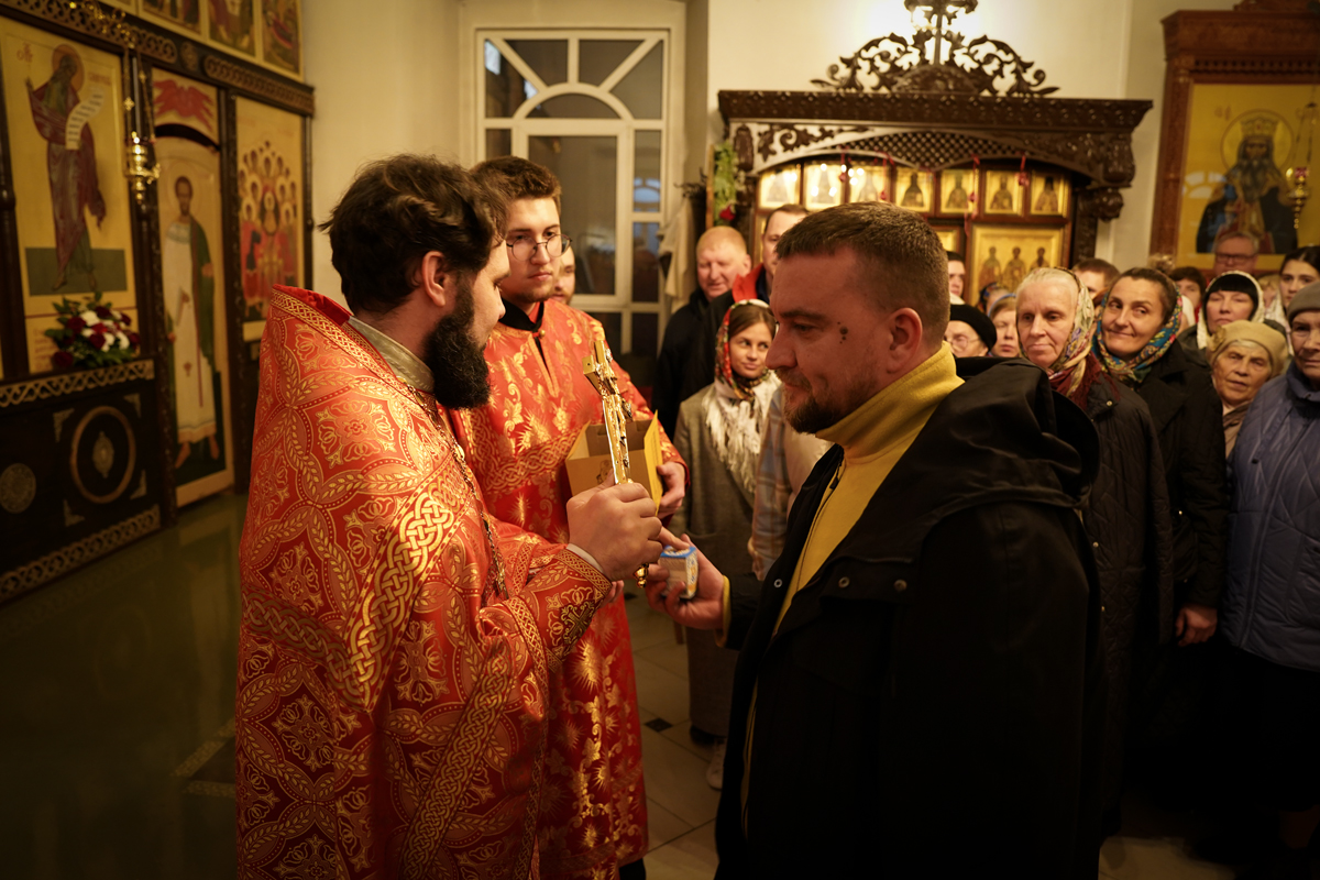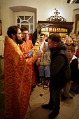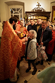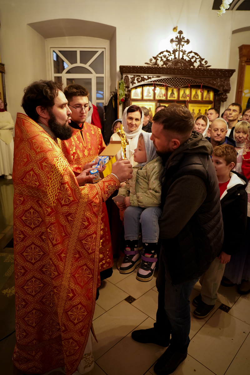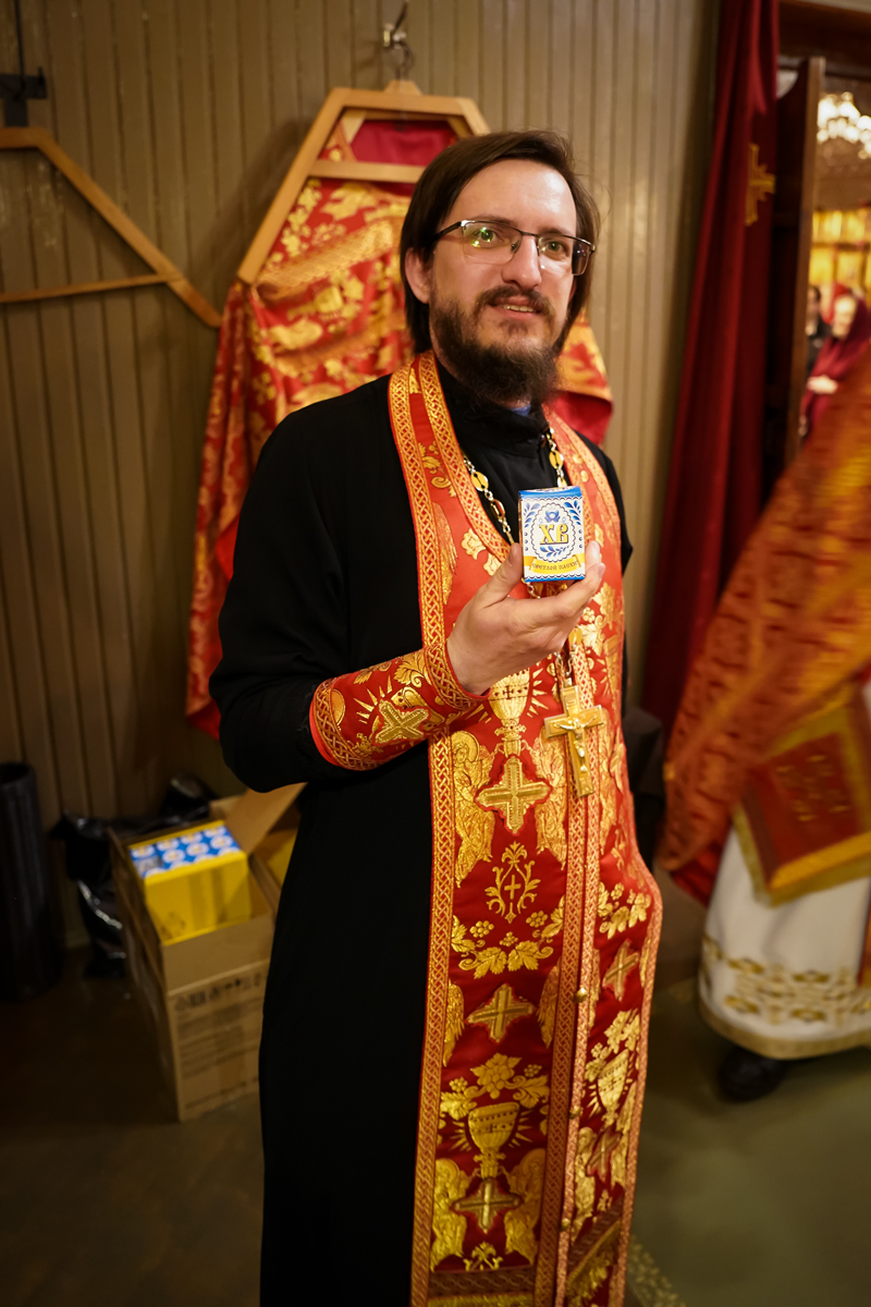 В завершении праздничного богослужения отец Михаил произнес проповедь и преподал всем молящимся крест для лобызания, а также вручил каждому шоколадное пасхальное яйцо.