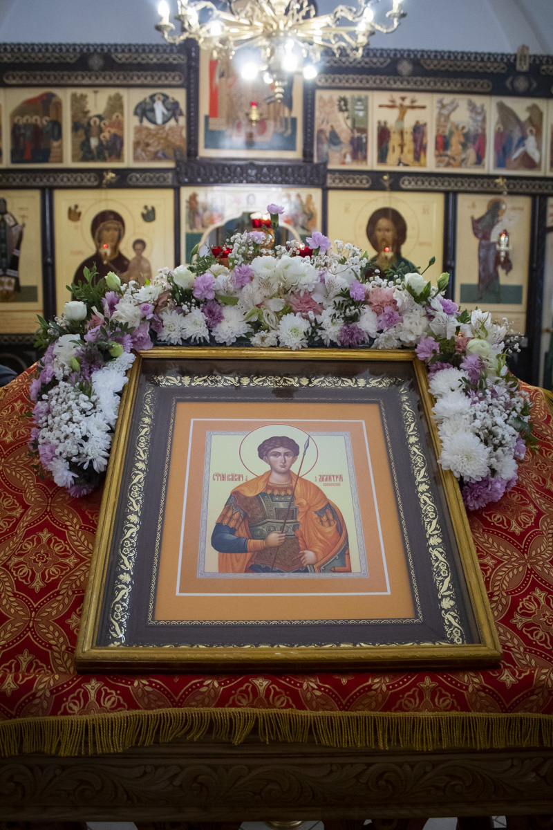 В завершении богослужения священник поздравил прихожан с праздником и обратился к ним со словом проповеди, в котором рассказал о житии вмч. Димитрия, особо отметив, что он по примеру своего Божественного Учителя являлся свечой, горящей и освещающей путь ко Христу как для жителей Солуни в 300 годах от Рождества Христова, так для нас сейчас.