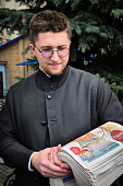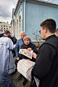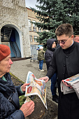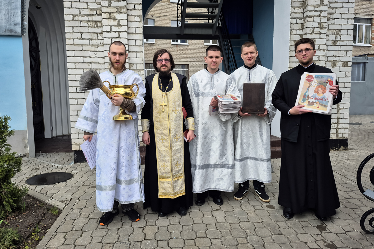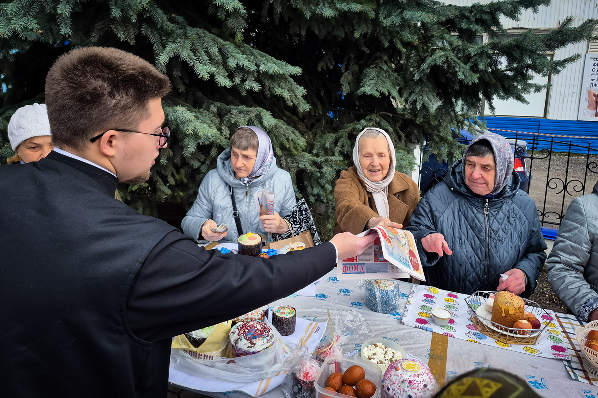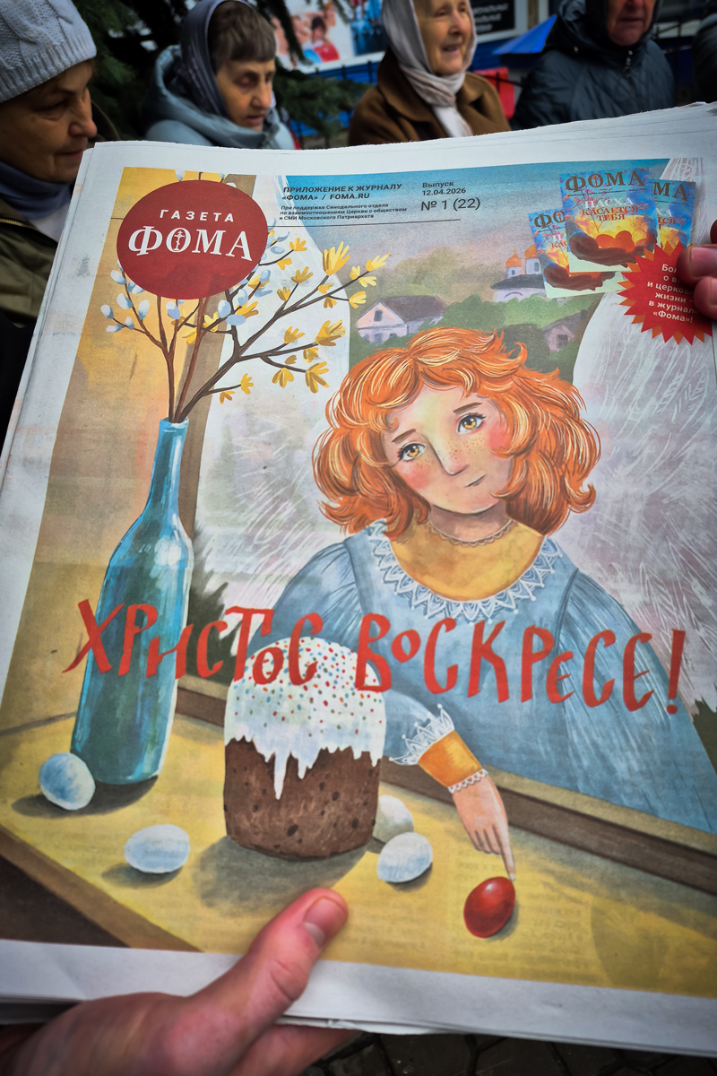 Пономари храма раздавали людям пасхальный выпуск газеты Фома, чтобы они могли прочитать и глубже понять основы нашей духовной традиции.