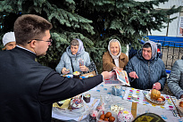 При освящении пасхальной снеди клирик храма пророка Божия Самуила иерей Виктор Соломахин обратился к пришедшим с кратким напутственным словом, разъяснив значение величайшего христианского праздника – Воскресения Христова, а также символическое значение обряда освящение продуктов.